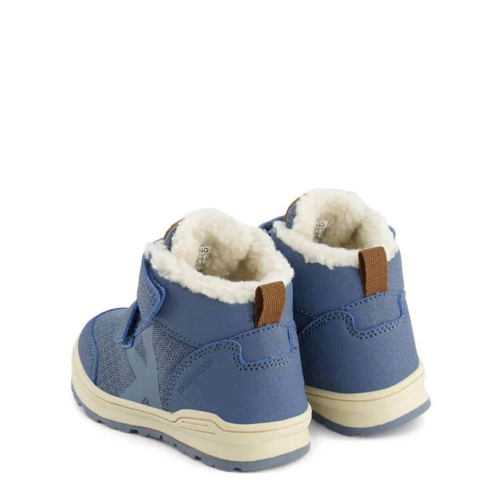 Your child will be ready to play outside. Blue Berlin boots by Kuling. The boots have a warm lining. They have a padded collar, velcro closures for easy on and off, a pull-tab at the heel and a non-slip sole.