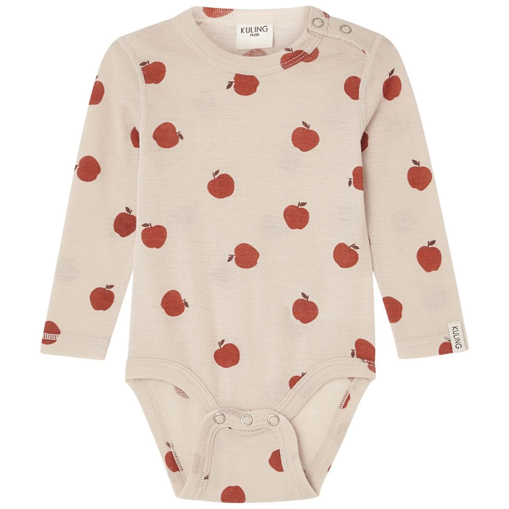 This wool baby body is a stylish first choice for cold days. Beige Brisbane baby body by Kuling. The baby body has snap buttons at the shoulder and between the legs.
