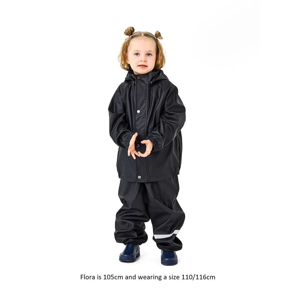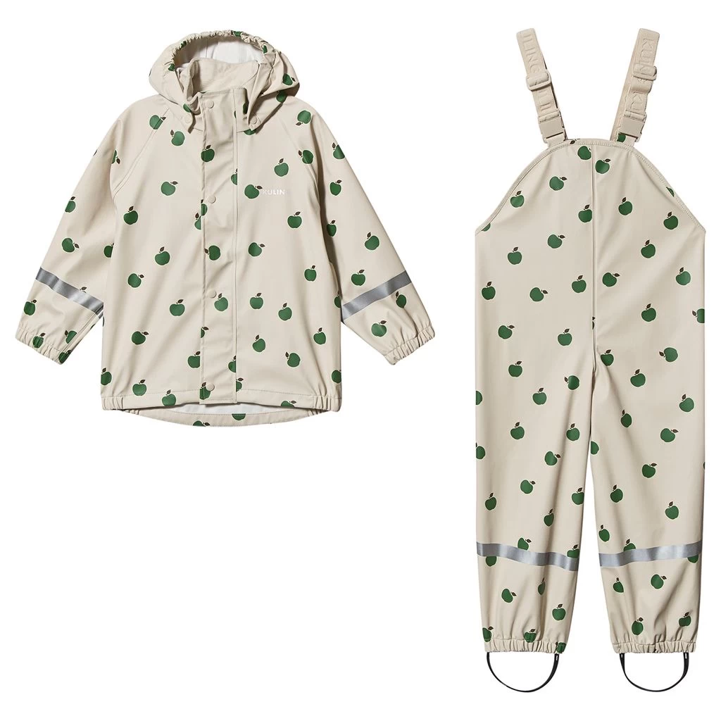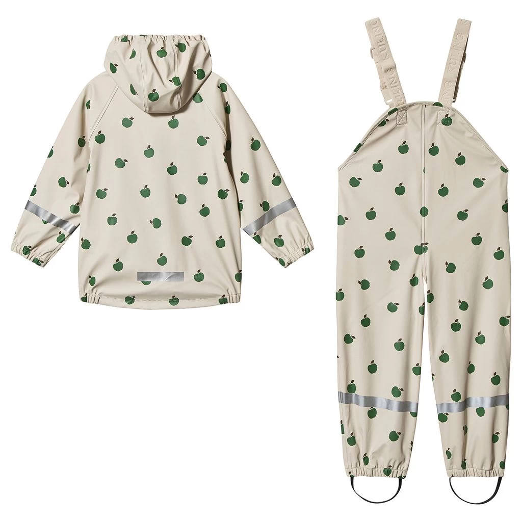 Keep them dry in style in this lightweight white fruit print jacket and trousers from Kuling’s special waterproof collection. Complete with a hardwearing and fluorine free water and dirt repellent Bionic Finish® ECO coating, the two-piece set has reflective details for visibility. The jacket features a YKK zip closure on the front, storm flap with snap buttons, elasticated cuffs and hem, removable hood with elasticated trim and fleece lined hood. To the trousers, there’s adjustable, elasticated shoulder straps, snap buttons on the sides and hardwearing, adjustable foot loops. Perfect for walks on drizzly days.