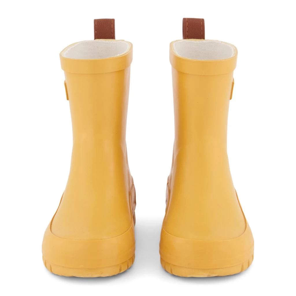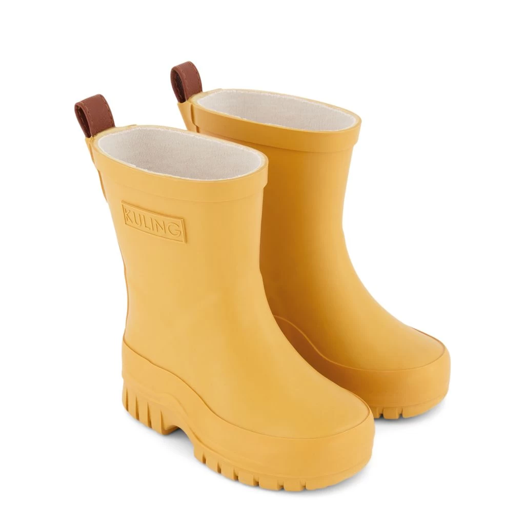 Yellow Caracas rain boots by Kuling. The boots have a rubber upper. They have a bonded lining, a pull tab at the back, removable insoles and a rubber sole with rough tread for a sure step.
