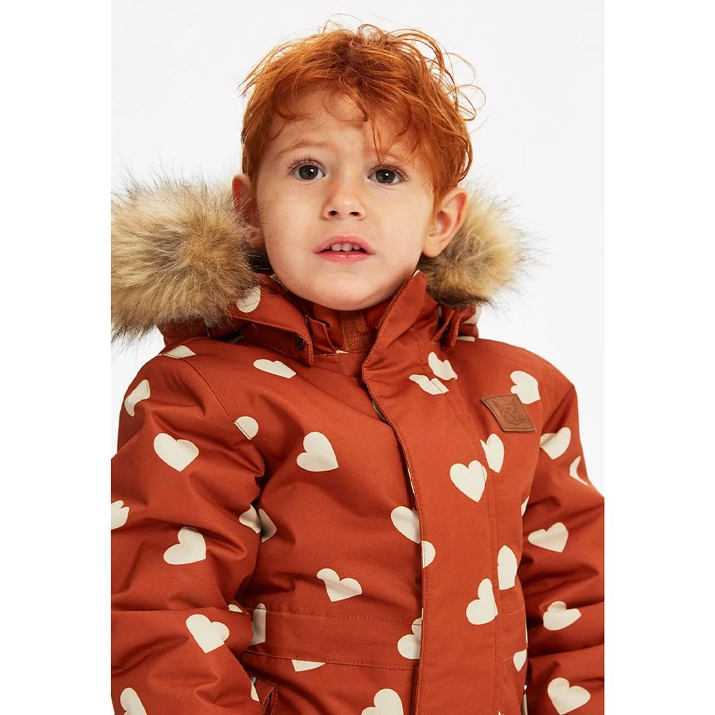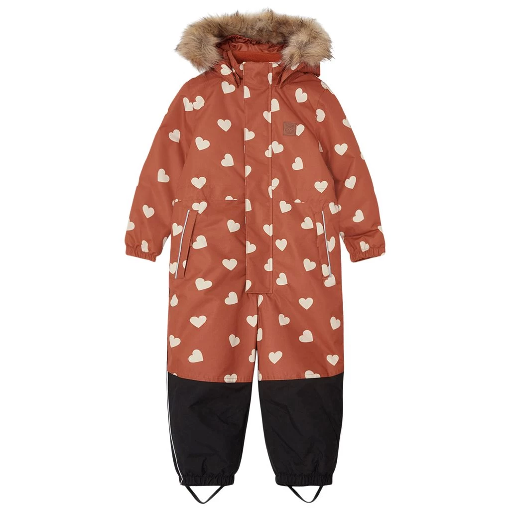 Be warm and comfy on winter adventures. Orange Chamonix snowsuit by Kuling. The snowsuit has taped seams. It has warm padding, a detachable hood with detachable faux fur trim, a zip closure at the front, two front pockets, elasticated cuffs, a reinforcement at the seat and at the leg ends and detachable, adjustable silicone foot loops.