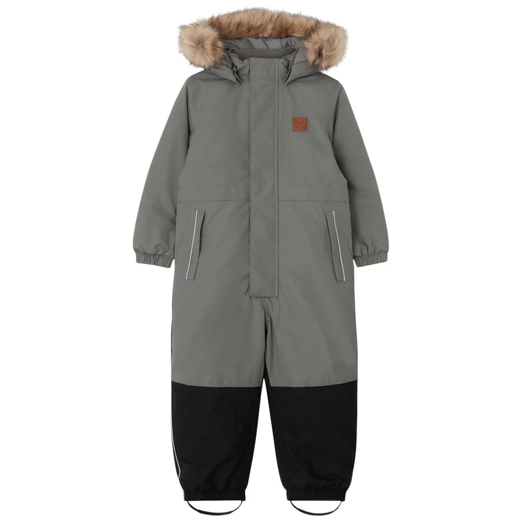 Be warm and comfy on winter adventures. Green Chamonix snowsuit by Kuling. The snowsuit has taped seams. It has warm padding, a detachable hood with detachable faux fur trim, a zip closure at the front, two front pockets, elasticated cuffs, a reinforcement at the seat and at the leg ends and detachable, adjustable silicone foot loops.
