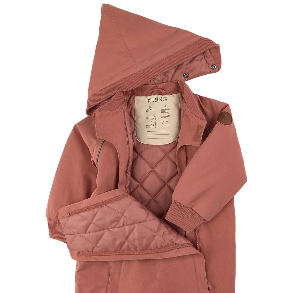 Pink Copenhagen coverall by Kuling. The coverall has taped seams. It has quilted padding, a detachable hood, double zip closures at the front, a chest pocket, ribbed cuffs, elasticated cuffs at the leg ends, detachable, adjustable silicone foot loops and reflective details for visibility.