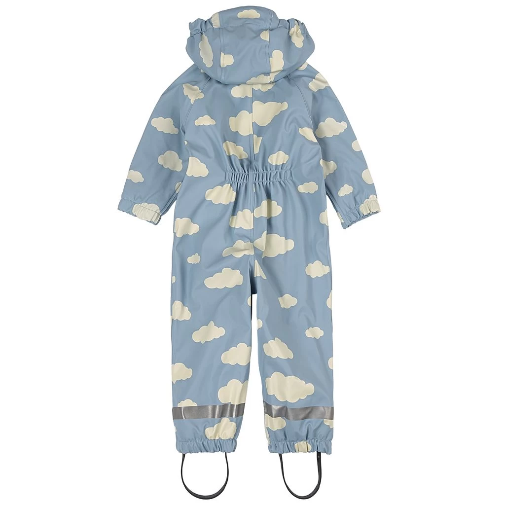 Time to jump through puddles. Blue Douglas rain coverall by Kuling. The coverall has welded seams. It has a soft fleece lining, a detachable hood, a zip closure at the front, elasticated cuffs, adjustable, detachable foot loops and reflective details for visibility.