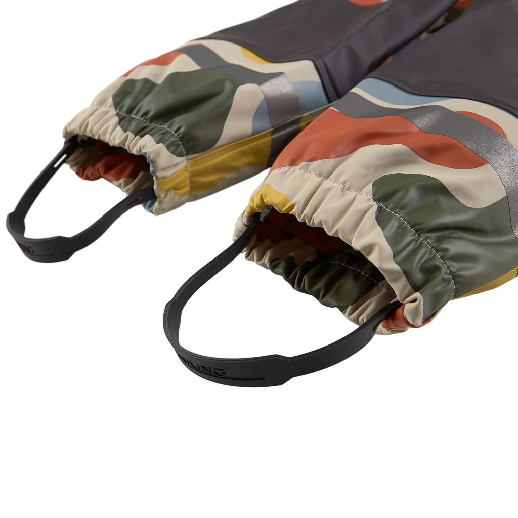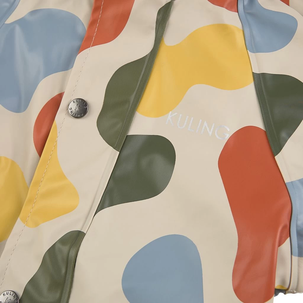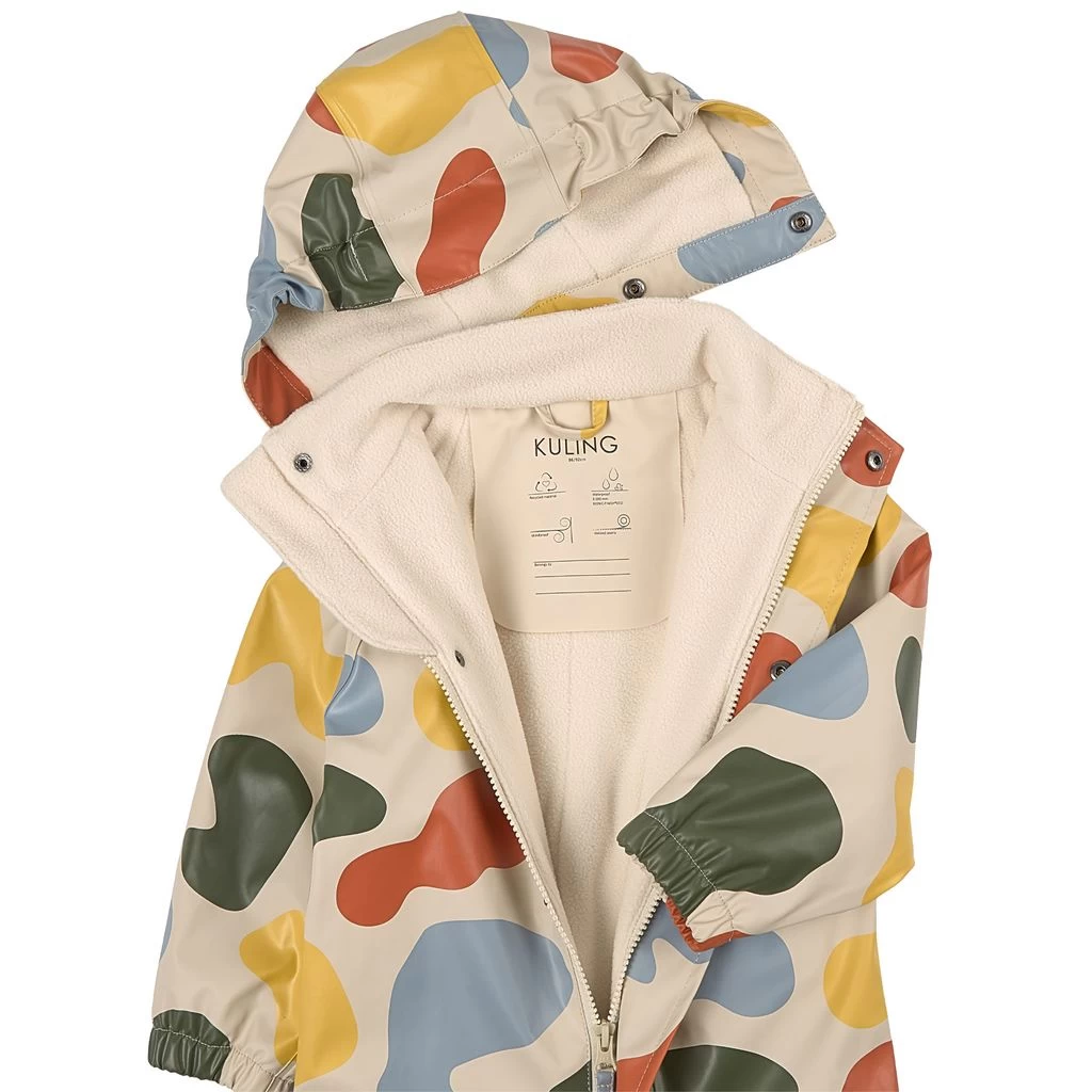 Time to jump through puddles. Beige Douglas rain coverall by Kuling. The coverall has welded seams. It has a soft fleece lining, a detachable hood, a zip closure at the front, elasticated cuffs, adjustable, detachable foot loops and reflective details for visibility.