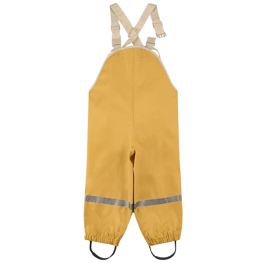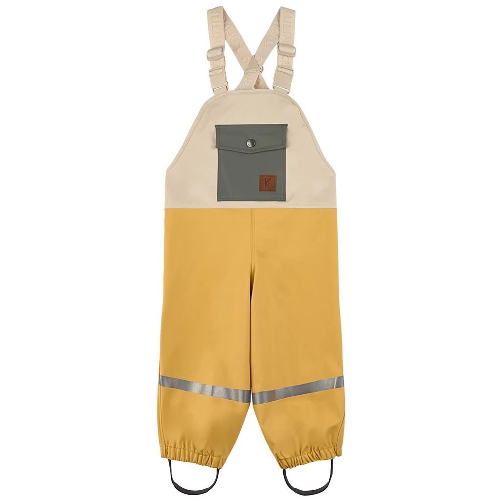 Rainy days won’t stand a chance. Yellow Edinburgh rain trousers by Kuling. The trousers have welded seams. They have elasticated, adjustable shoulder straps, one front pocket, elasticated cuffs, adjustable silicone foot loops and reflective details for visibility.