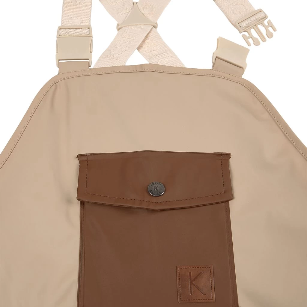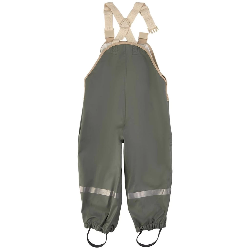 Rainy days won’t stand a chance. Green Edinburgh rain trousers by Kuling. The trousers have welded seams. They have elasticated, adjustable shoulder straps, one front pocket, elasticated cuffs, adjustable silicone foot loops and reflective details for visibility.