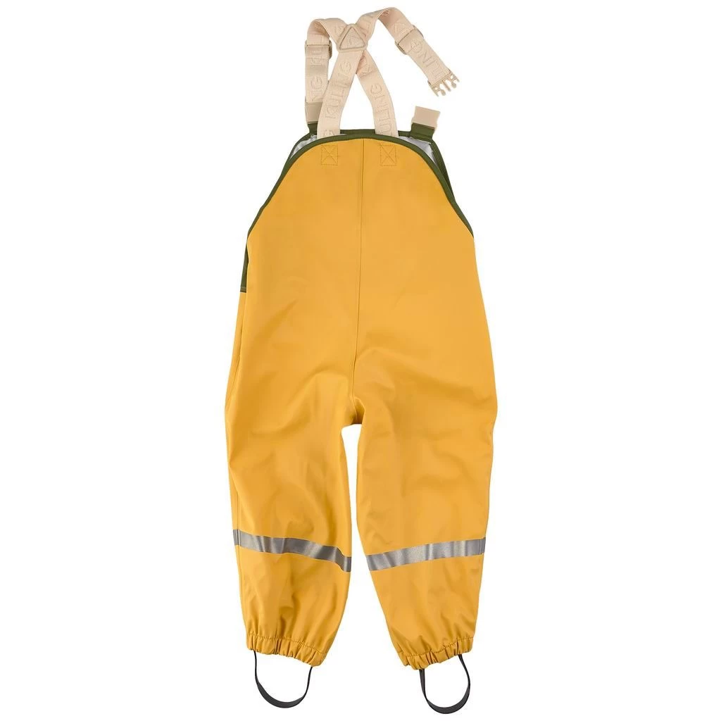 Rainy days won’t stand a chance. Yellow Edinburgh rain trousers by Kuling. The trousers have welded seams. They have elasticated, adjustable shoulder straps, one front pocket, elasticated cuffs, adjustable silicone foot loops and reflective details for visibility.