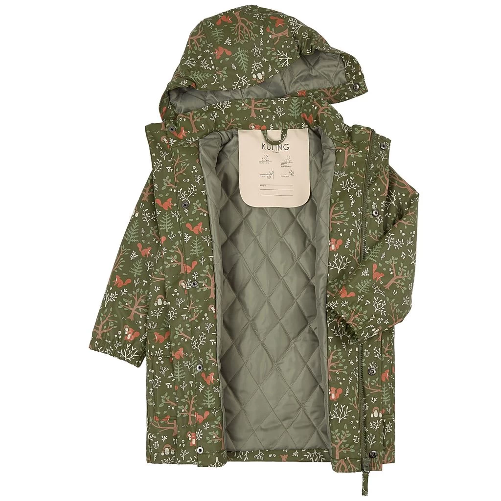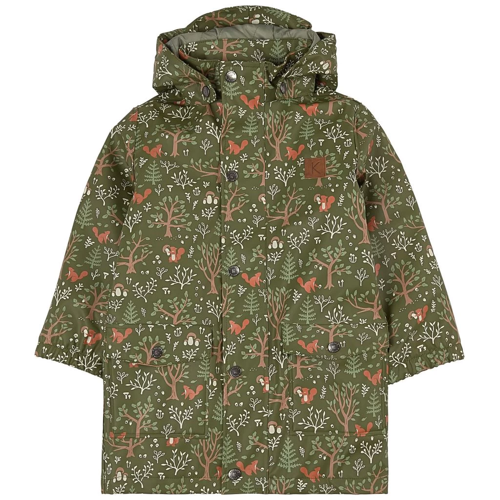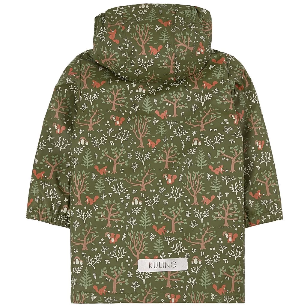 Rainy days won’t stand a chance. Green Faro raincoat by Kuling. The jacket has welded seams. It has a quilted lining, a detachable hood, a zip closure at the front, elasticated cuffs and two front pockets.