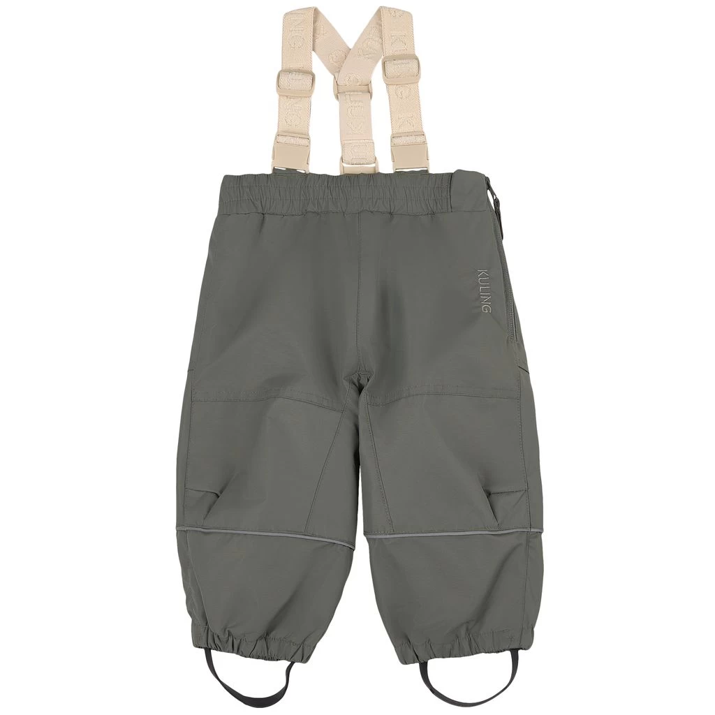 Get ready for outdoor adventures. Green Going shell trousers by Kuling. The trousers have taped seams. They have adjustable, detachable shoulder straps, two front pockets, elasticated cuffs, adjustable, detachable silicone foot loops and reflective details for visibility.