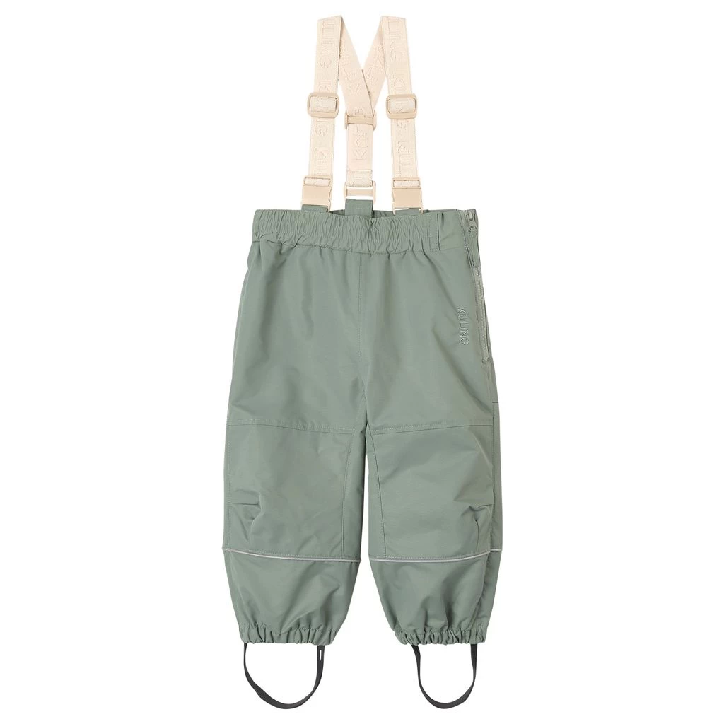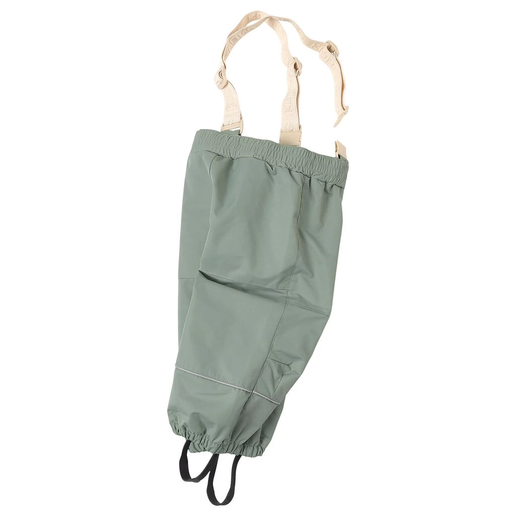 Get ready for outdoor adventures. Green Going shell pants by Kuling. The pants have taped seams. They have adjustable, detachable shoulder straps, an elasticated waist, a zip closure on the side, two front pockets, elasticated cuffs, durable silicone foot loops and reflective details for visibility.