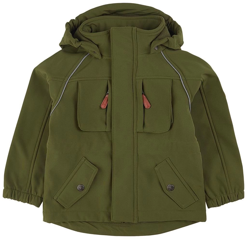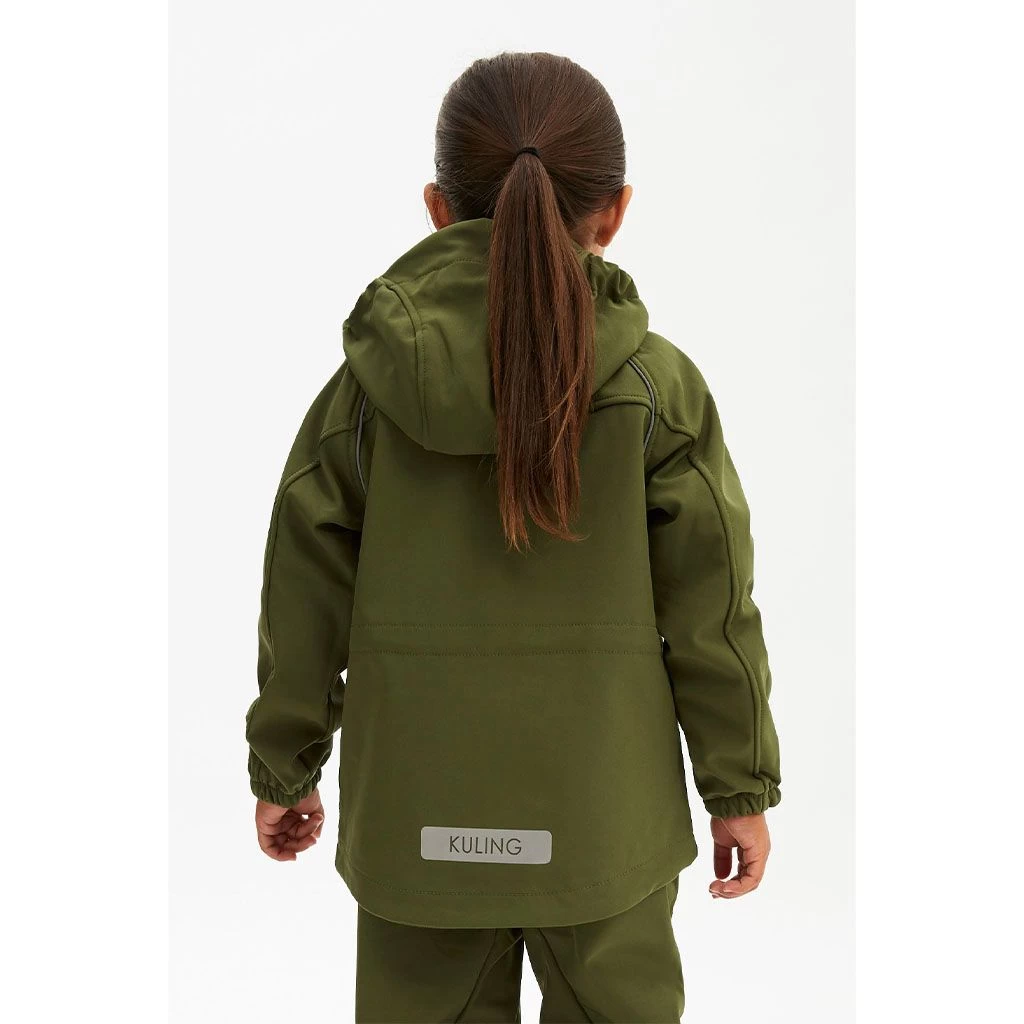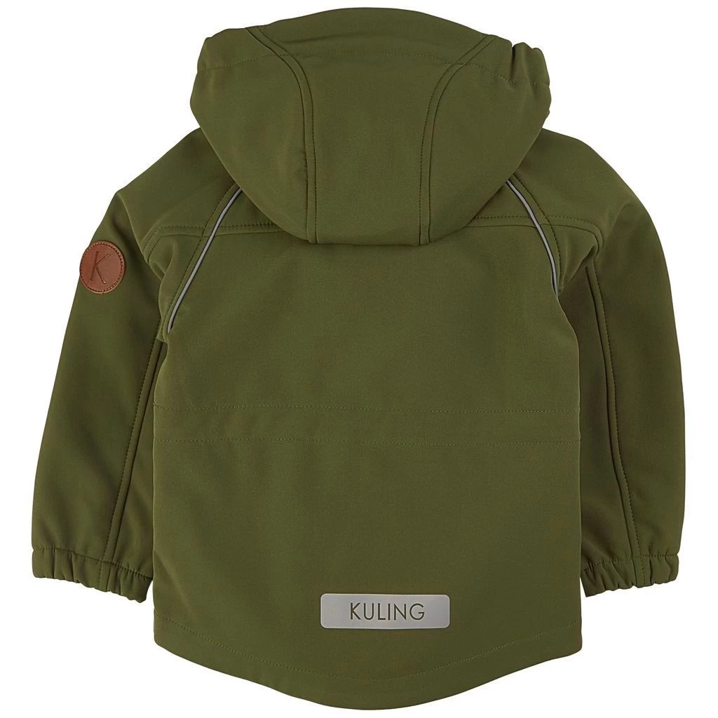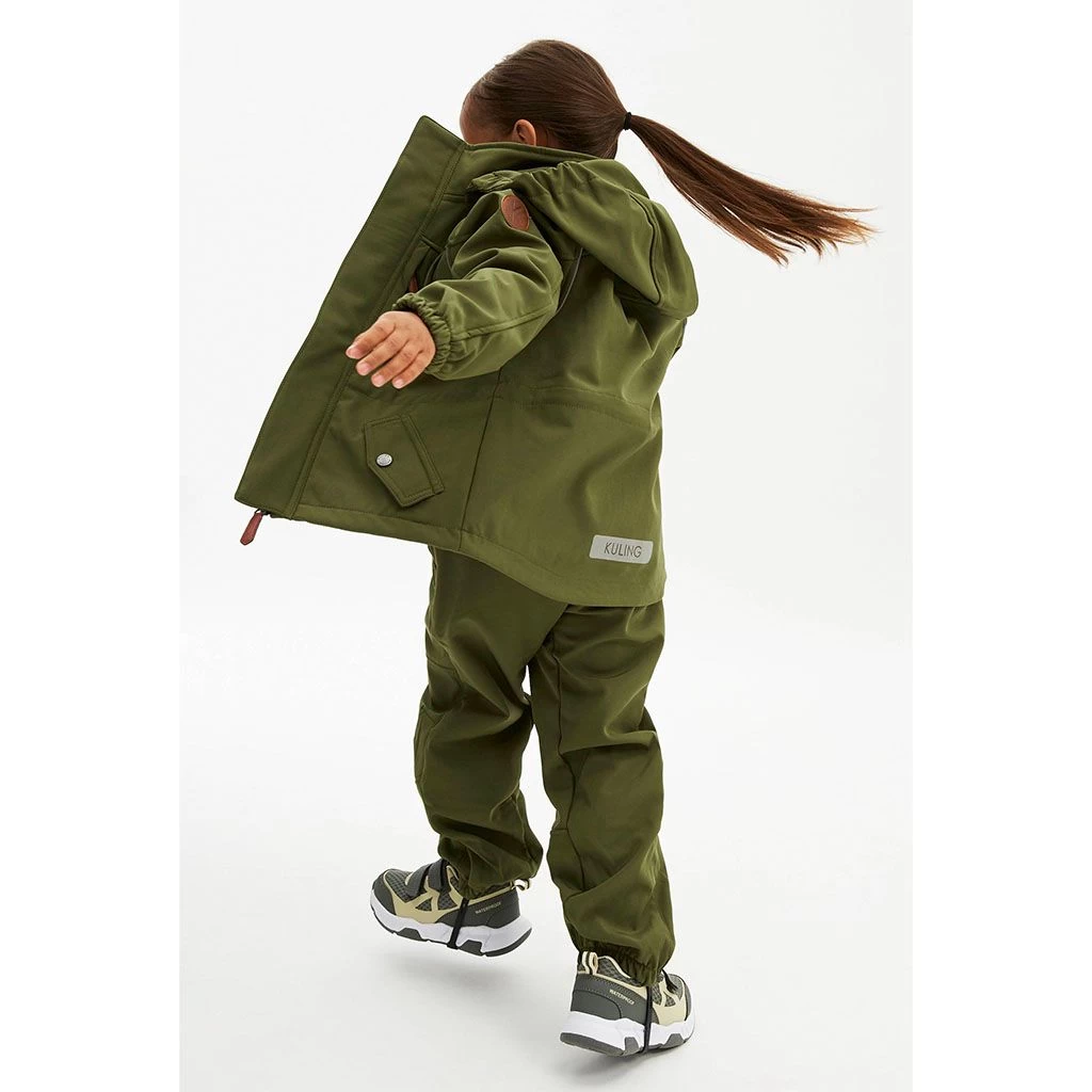 Get ready for play filled days. Green Gothenburg softshell jacket by Kuling. The softshell jacket has taped seams. It has a soft fleece lining, a detachable hood, a zip closure at the front, two front pockets, elasticated cuffs and reflective details for visibility.