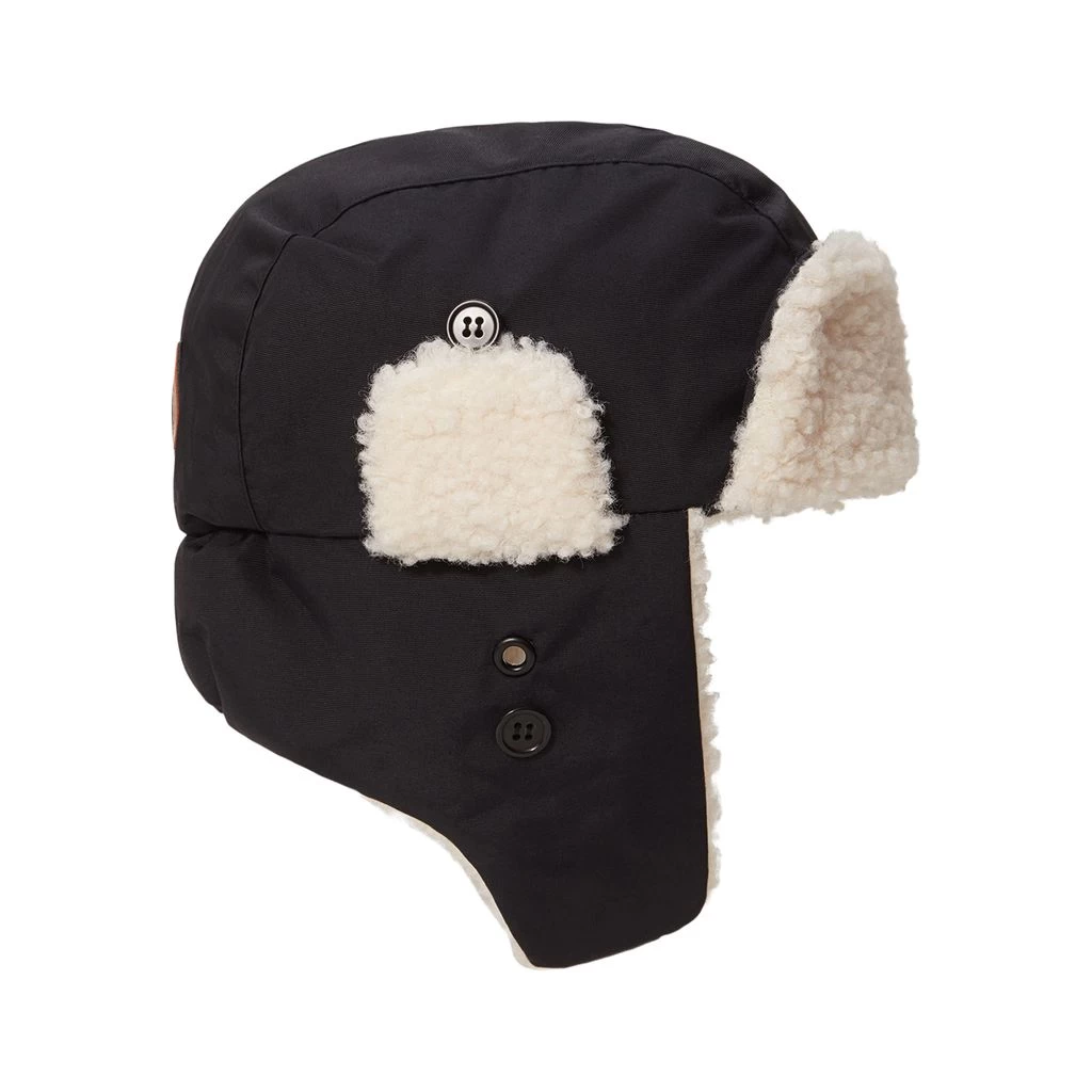 Keep little heads warm. Black Levi trapper hat by Kuling. The trapper hat has taped seams. It has a soft fleece lining, a velcro closure at the chin and teddy fleece lined earflaps.