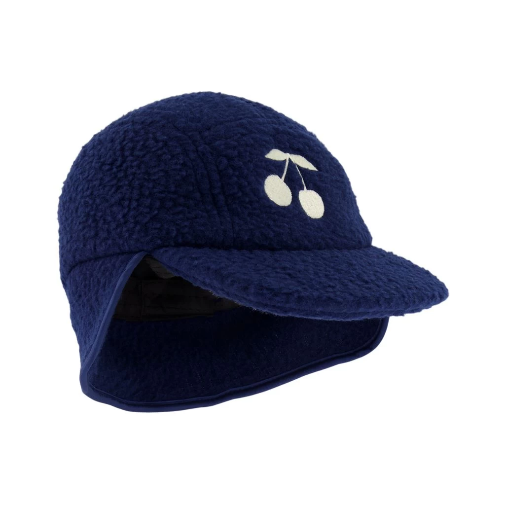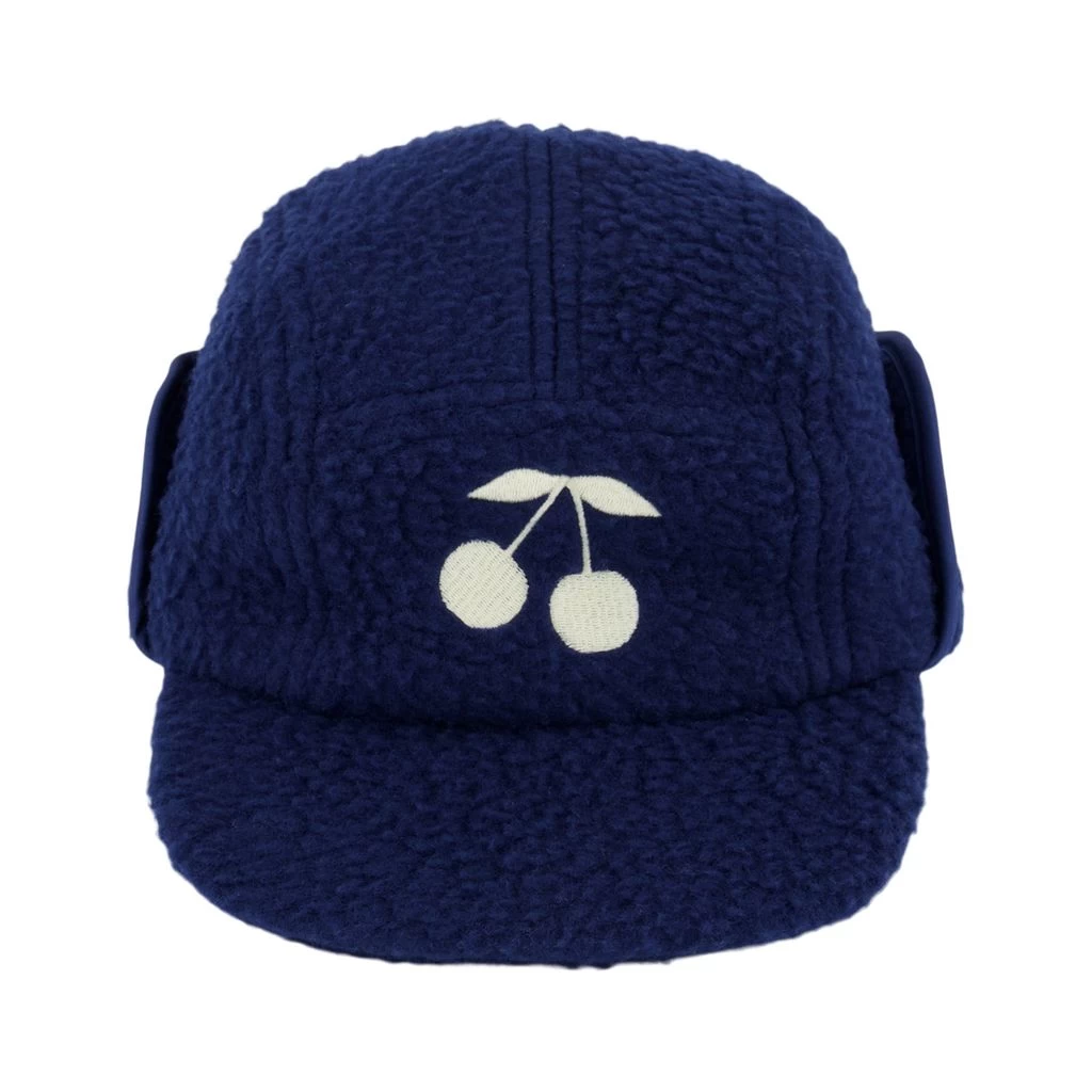 Navy Limited Edition Cherry Pile Fleece cap by Kuling. The cap has a soft fleece material. It has a flat bill, a longer material at the back and an embroidered cherry at the front.