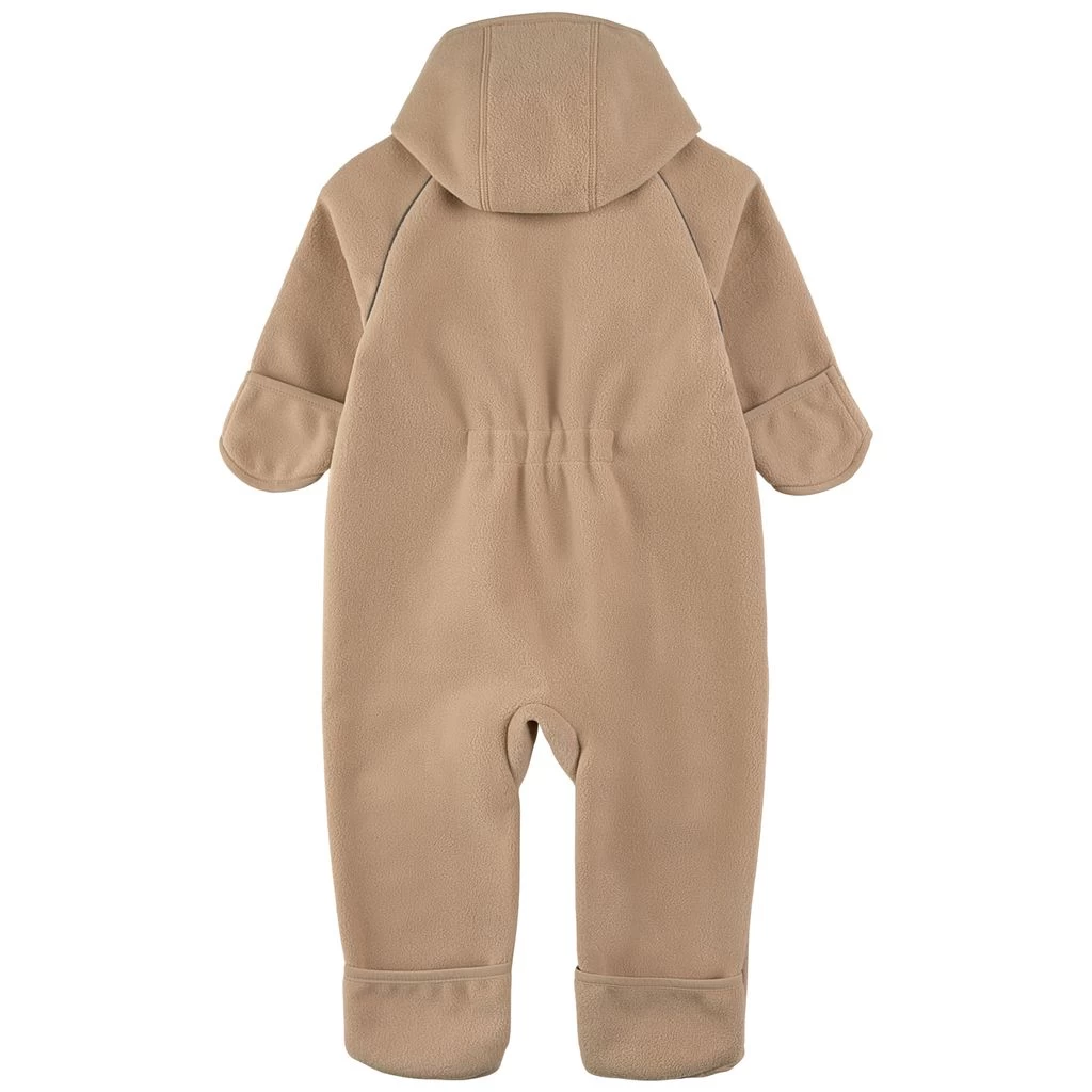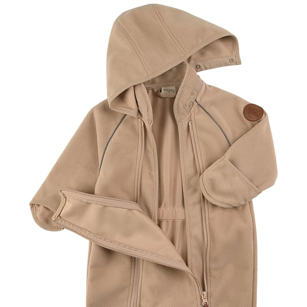 Get ready for outdoor adventures. Beige Livigno coverall by Kuling. The coverall has a detachable hood. It has double zip closures at the front, two front pockets, ribbed cuffs and reflective details for visibility.
