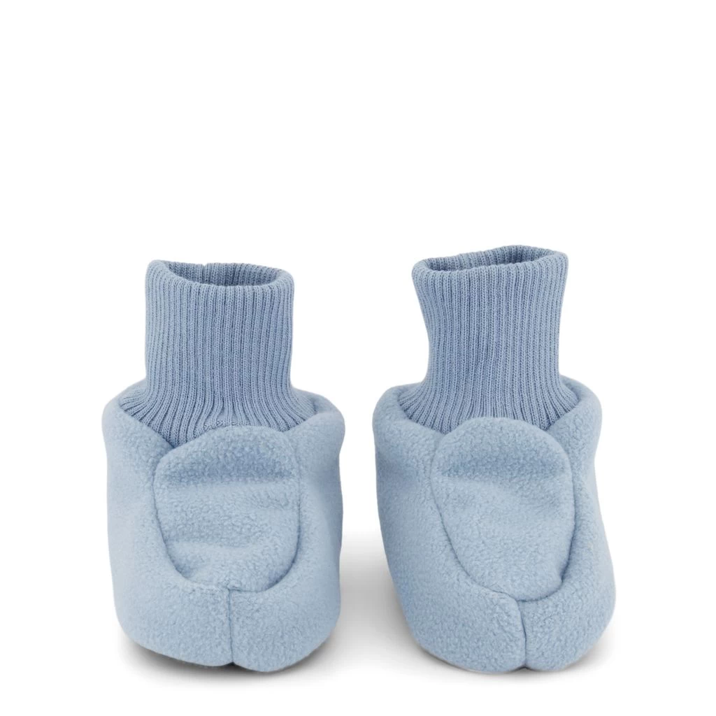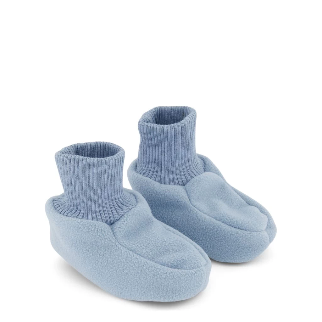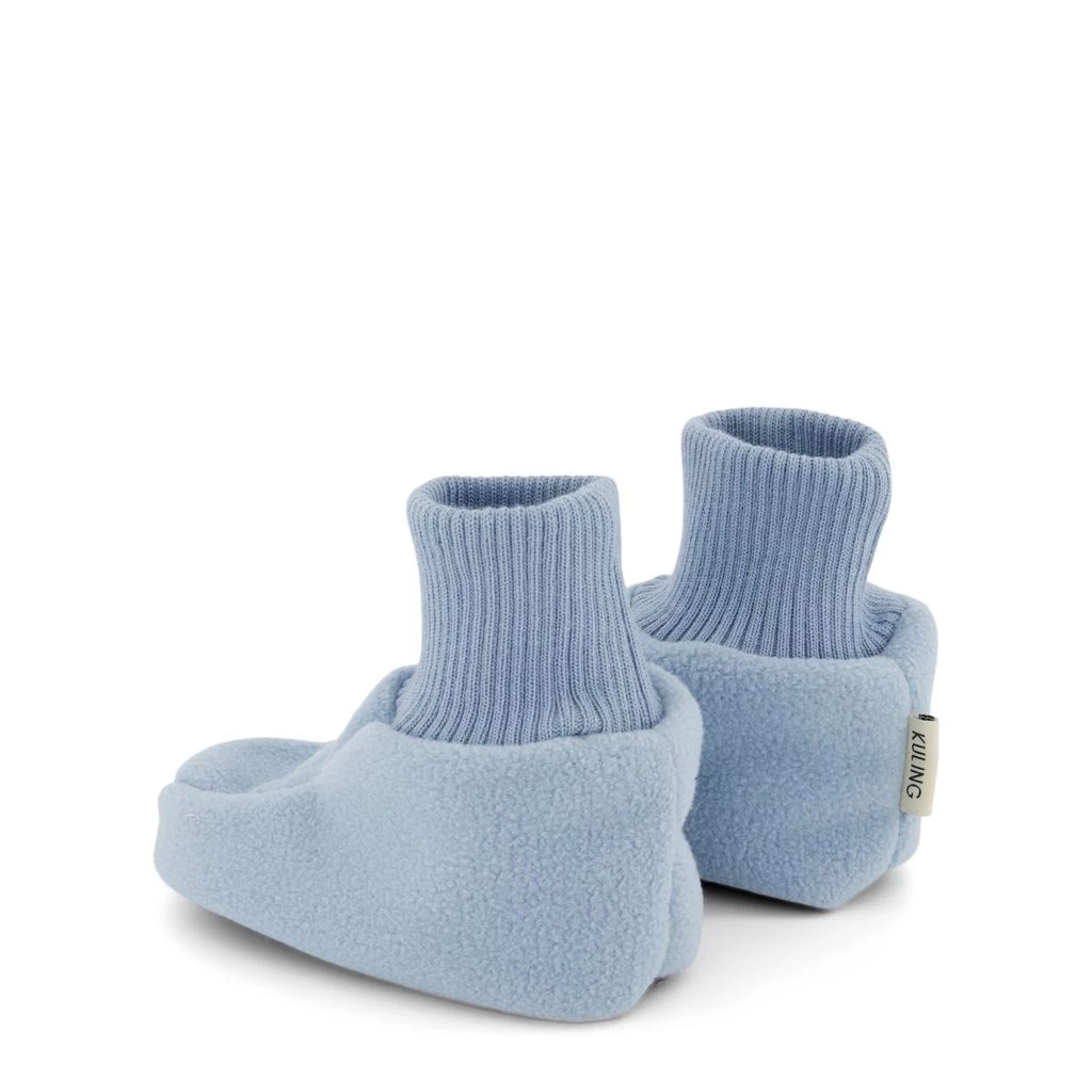 Keep little feet warm. Blue Livigno wind fleece booties by Kuling. The wind fleece booties have ribbed cuffs. They have soles with non-slip details.