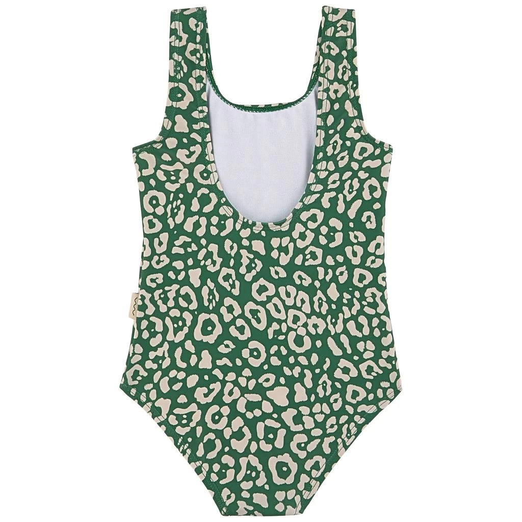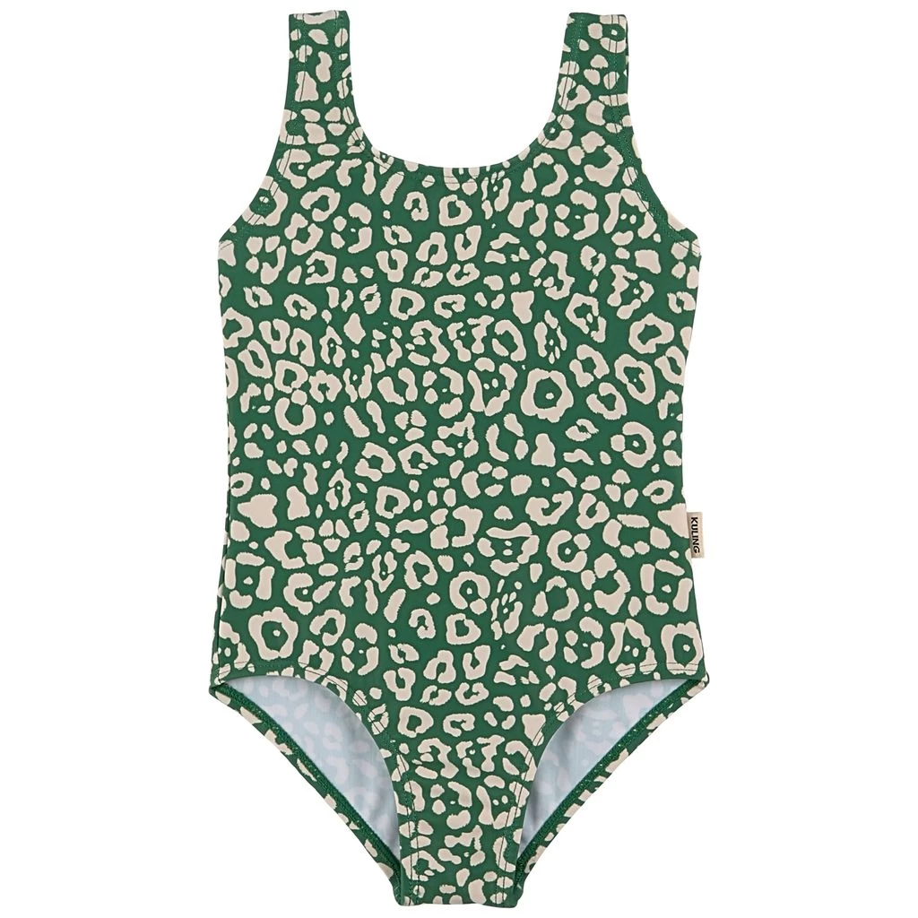 Time to go for a swim. Green Milos swimsuit by Kuling. The swimsuit has a quick-drying, stretchy material.