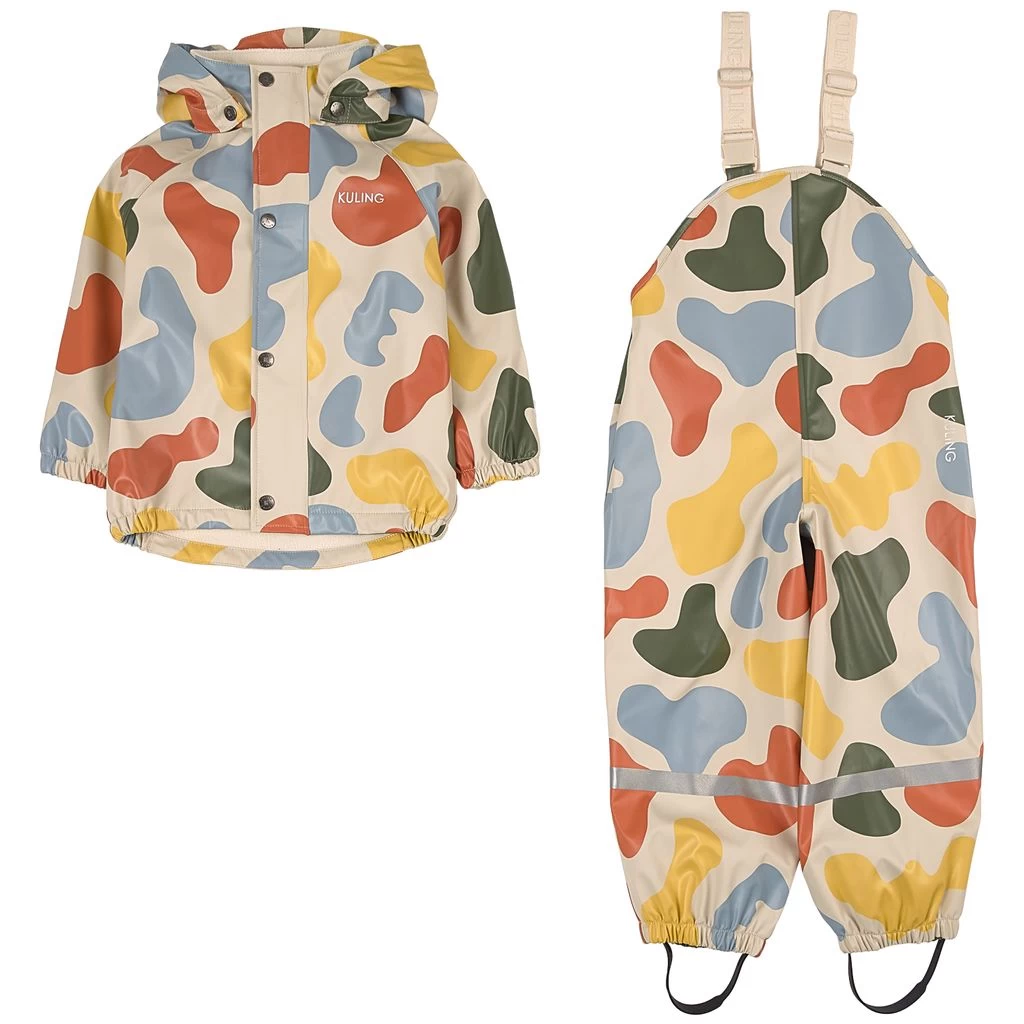 Rainy days won’t stand a chance. Muju rain set by Kuling. The set has welded seams. It has a soft fleece lining, a jacket with a detachable hood, a YKK® zipper at the front, elasticated cuffs and an elasticated hem, pants with adjustable, elasticated shoulder straps, snap buttons at the sides, elasticated cuffs and adjustable, detachable silicone foot loops and reflective details for visibility.