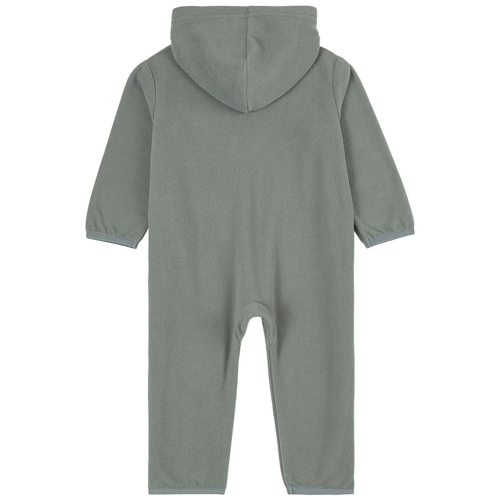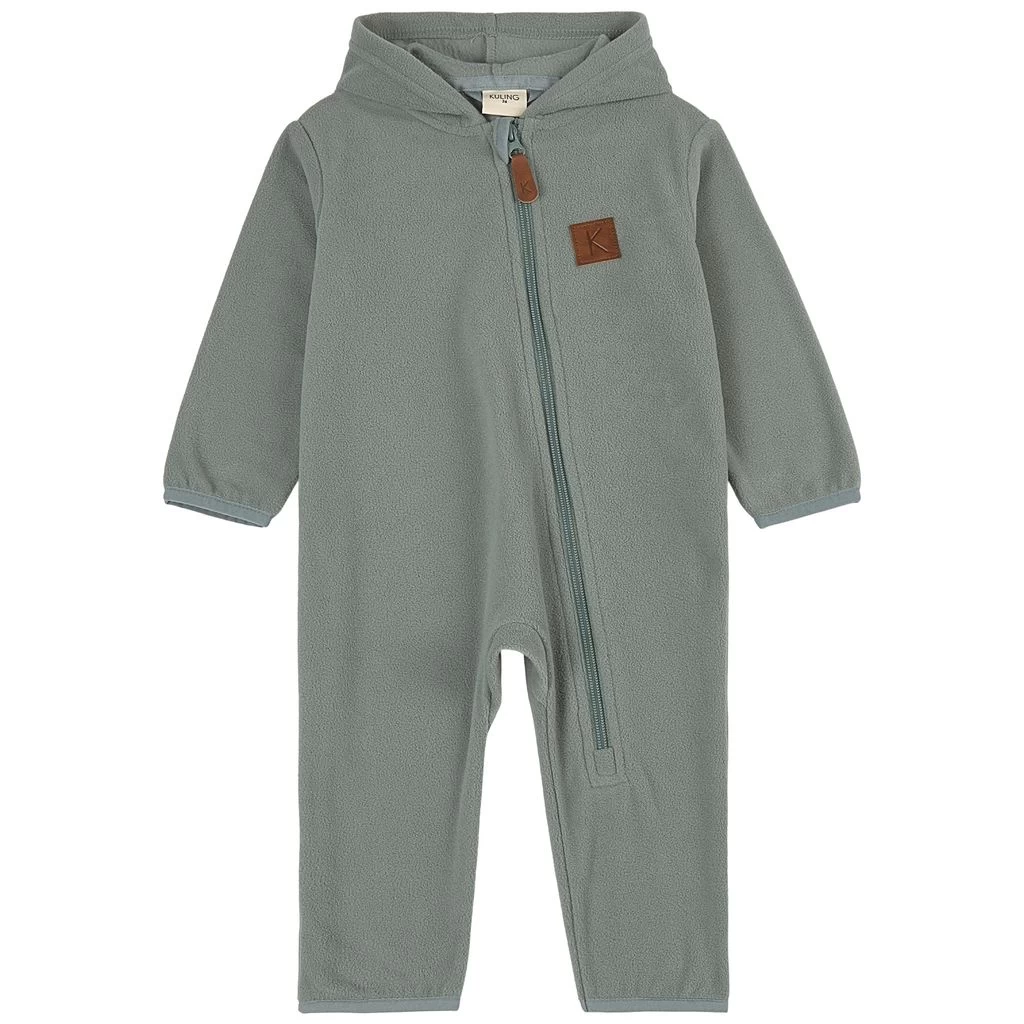 Keep warm with comfy fleece. Green Northpole fleece coverall by Kuling. The fleece coverall has a fixed hood. It has a zip closure at the front.