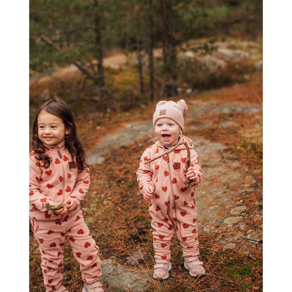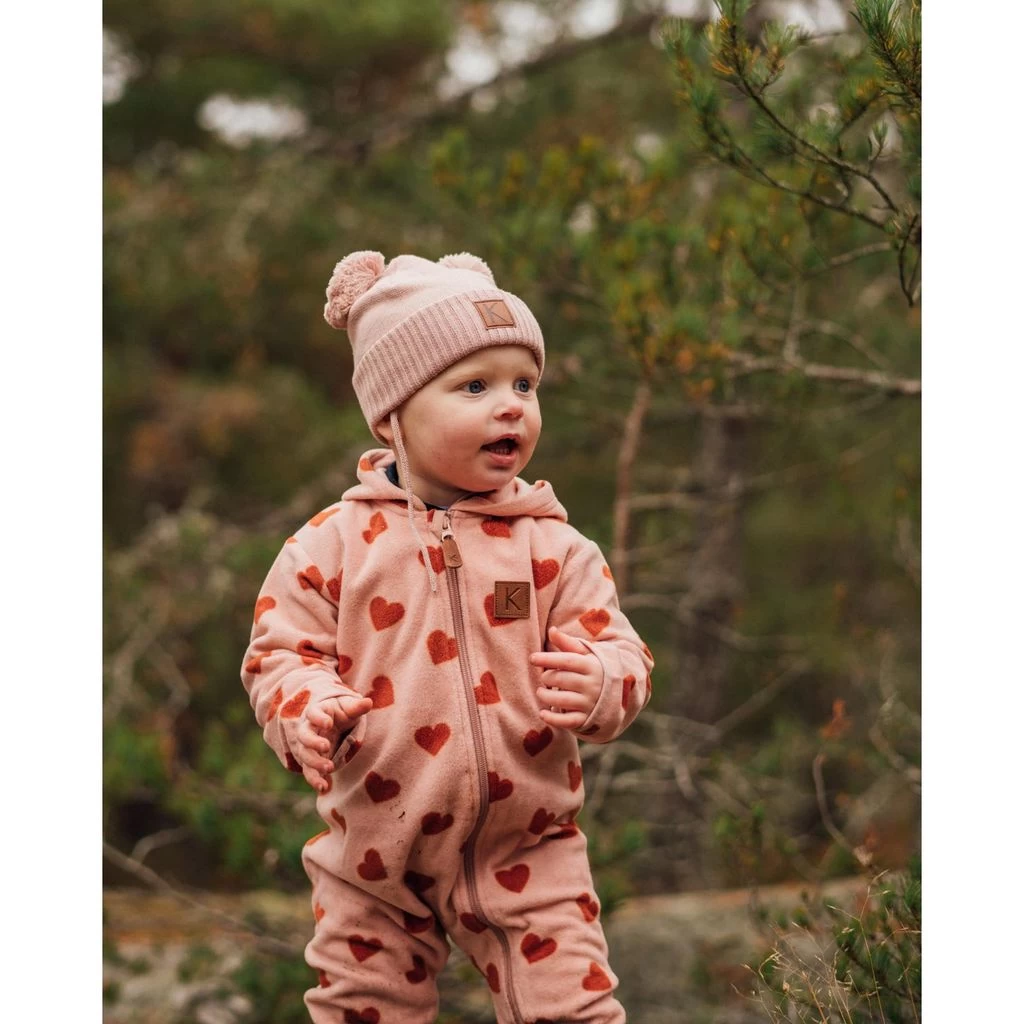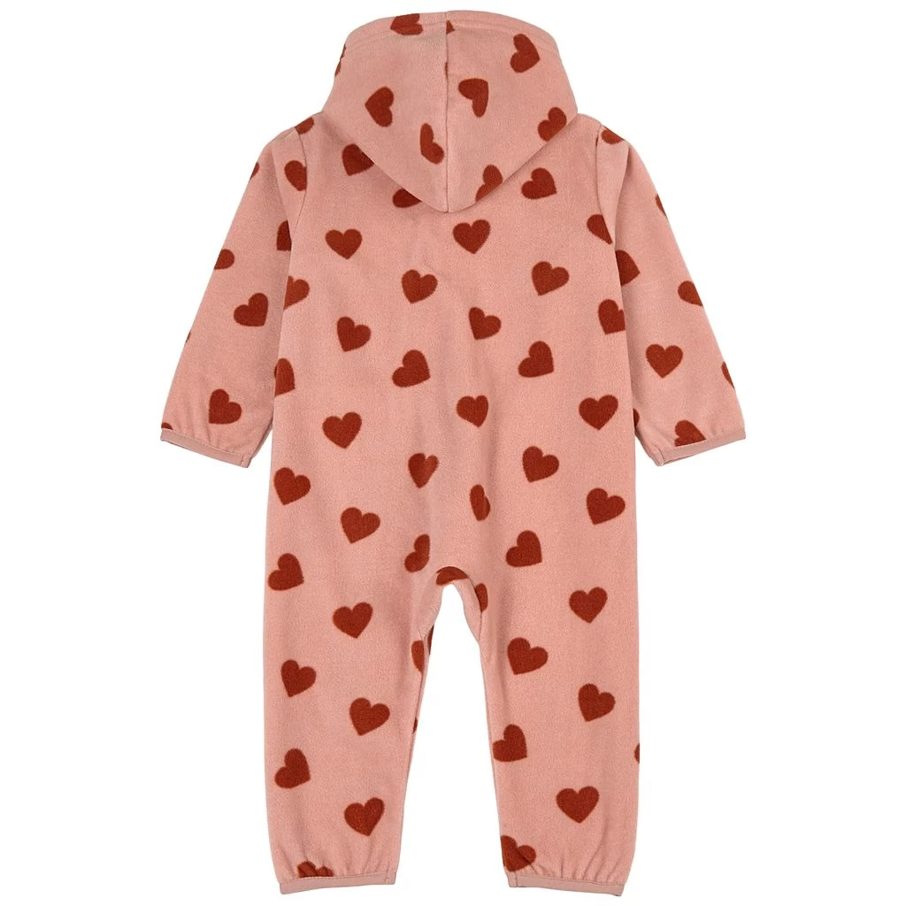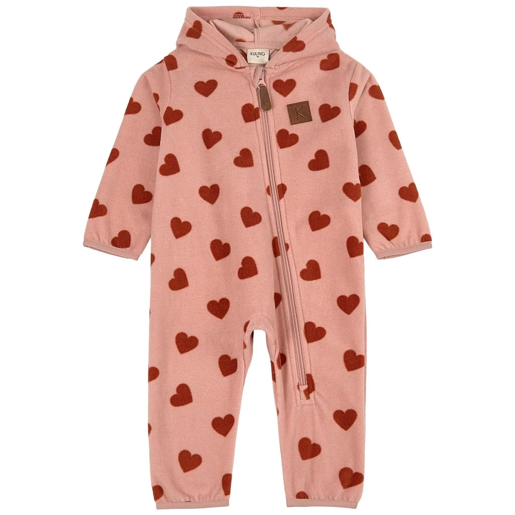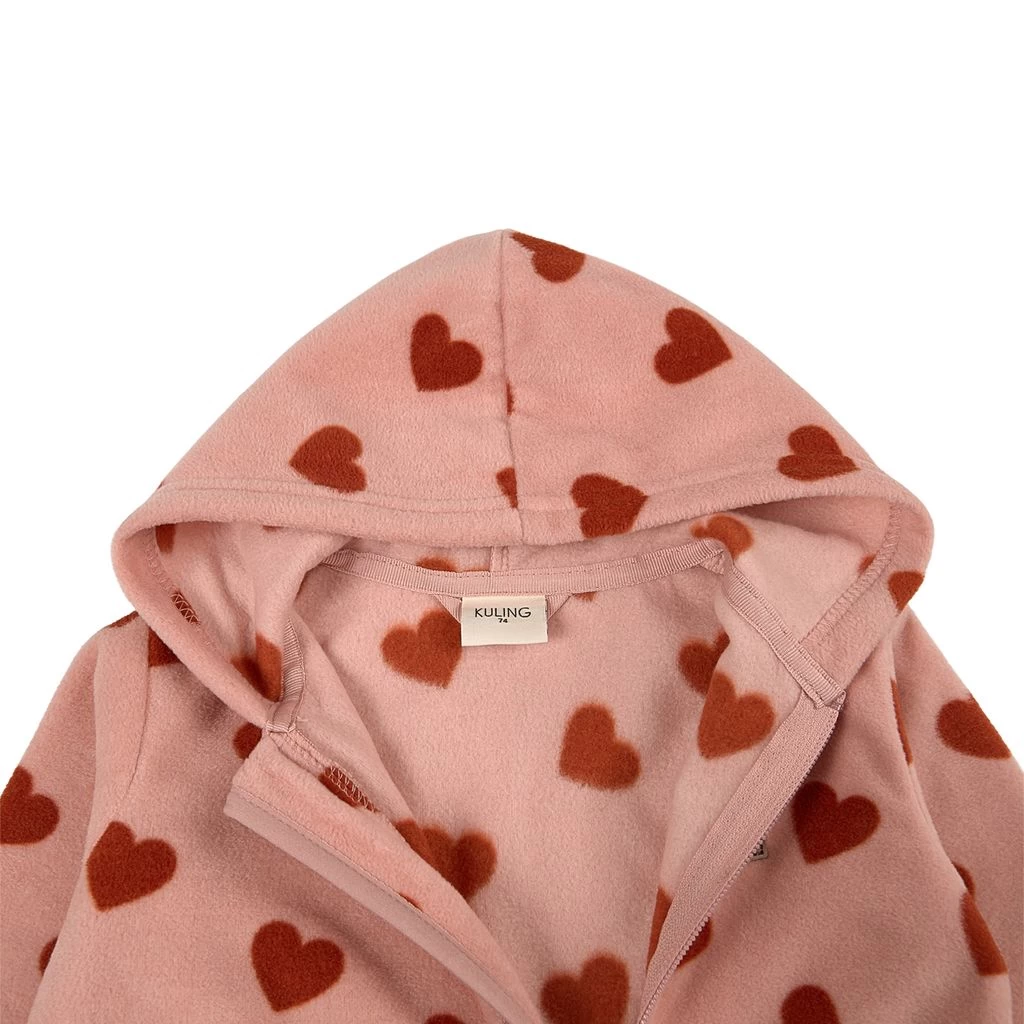 Keep warm with comfy fleece. Pink Northpole fleece coverall by Kuling. The fleece coverall has a fixed hood. It has a zip closure at the front.