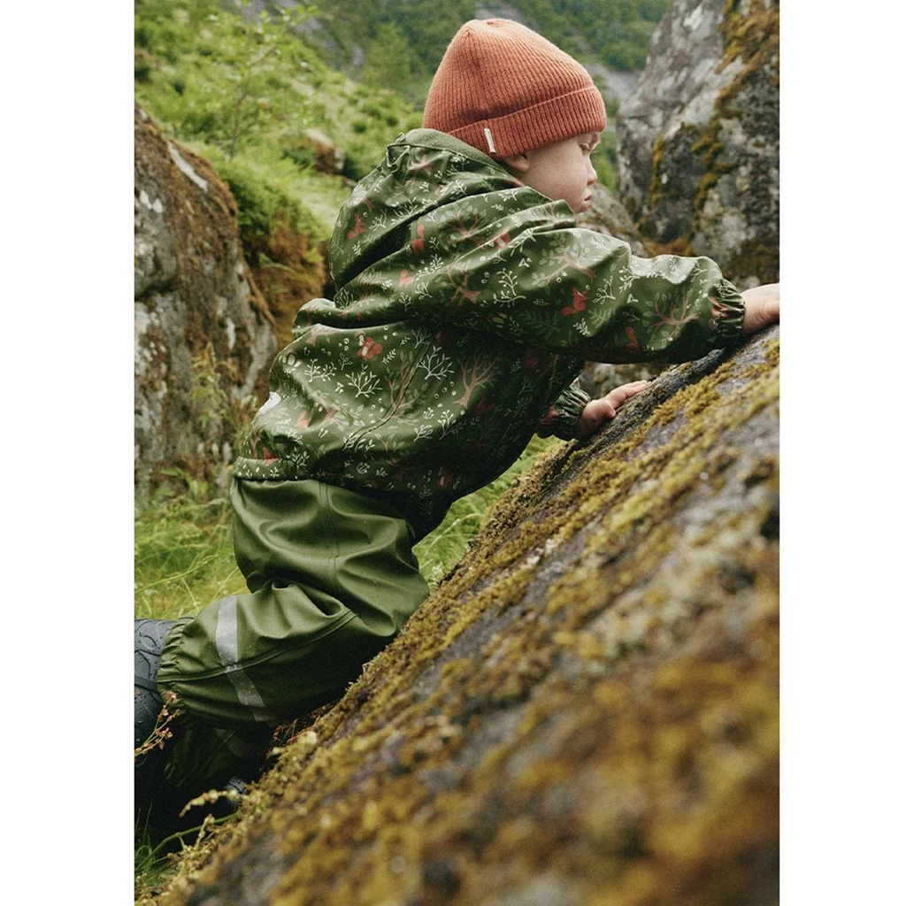 Time to jump through puddles. Green Ottawa rain set by Kuling. The set has welded seams. It has a soft fleece lining, a jacket with a detachable hood, a YKK® zipper at the front and elasticated cuffs, pants with a fleece bodice, velcro closure at the shoulders, a YKK® zipper at the front, an elasticated waist and durable, adjustable silicone foot loops and reflective details for visibility.