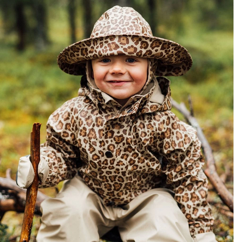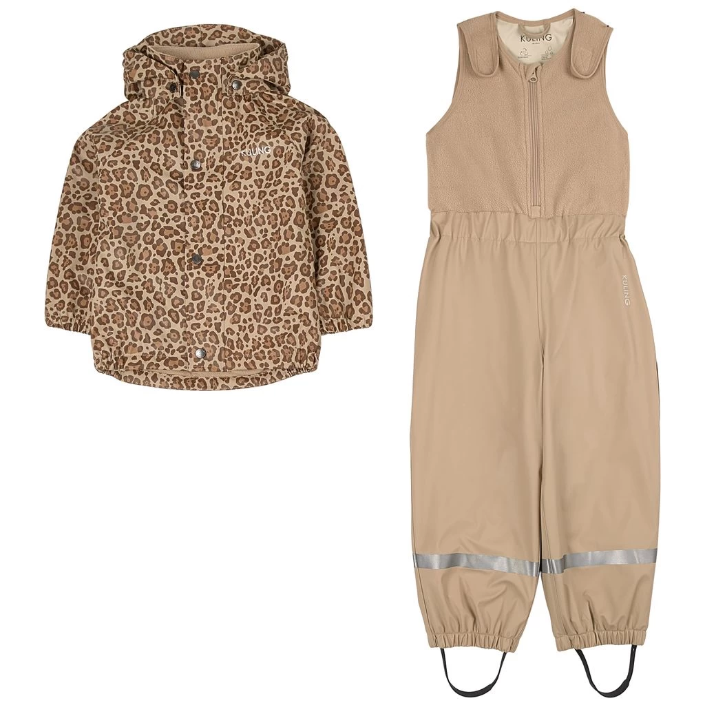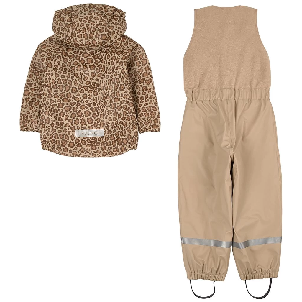 Time to jump through puddles. Brown Ottawa rain set by Kuling. The set has welded seams. It has a soft fleece lining, a jacket with a detachable hood, a YKK® zipper at the front and elasticated cuffs, pants with a fleece bodice, velcro closure at the shoulders, a YKK® zipper at the front, an elasticated waist and durable, adjustable silicone foot loops and reflective details for visibility.