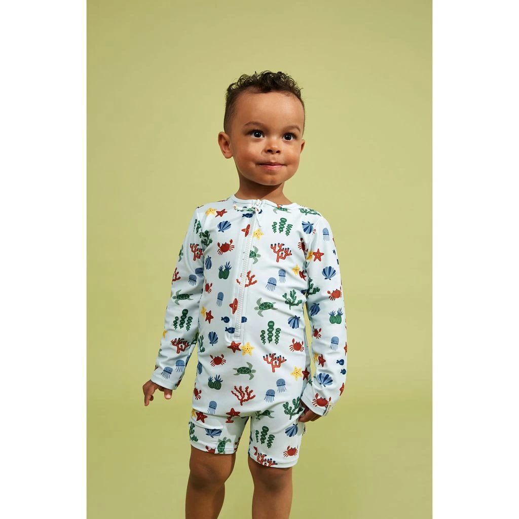 Perfect for some fun on the beach. Blue Paros one-piece rashguard swimsuit by Kuling. The one-piece rashguard swimsuit has a stretchy, quick-drying material.