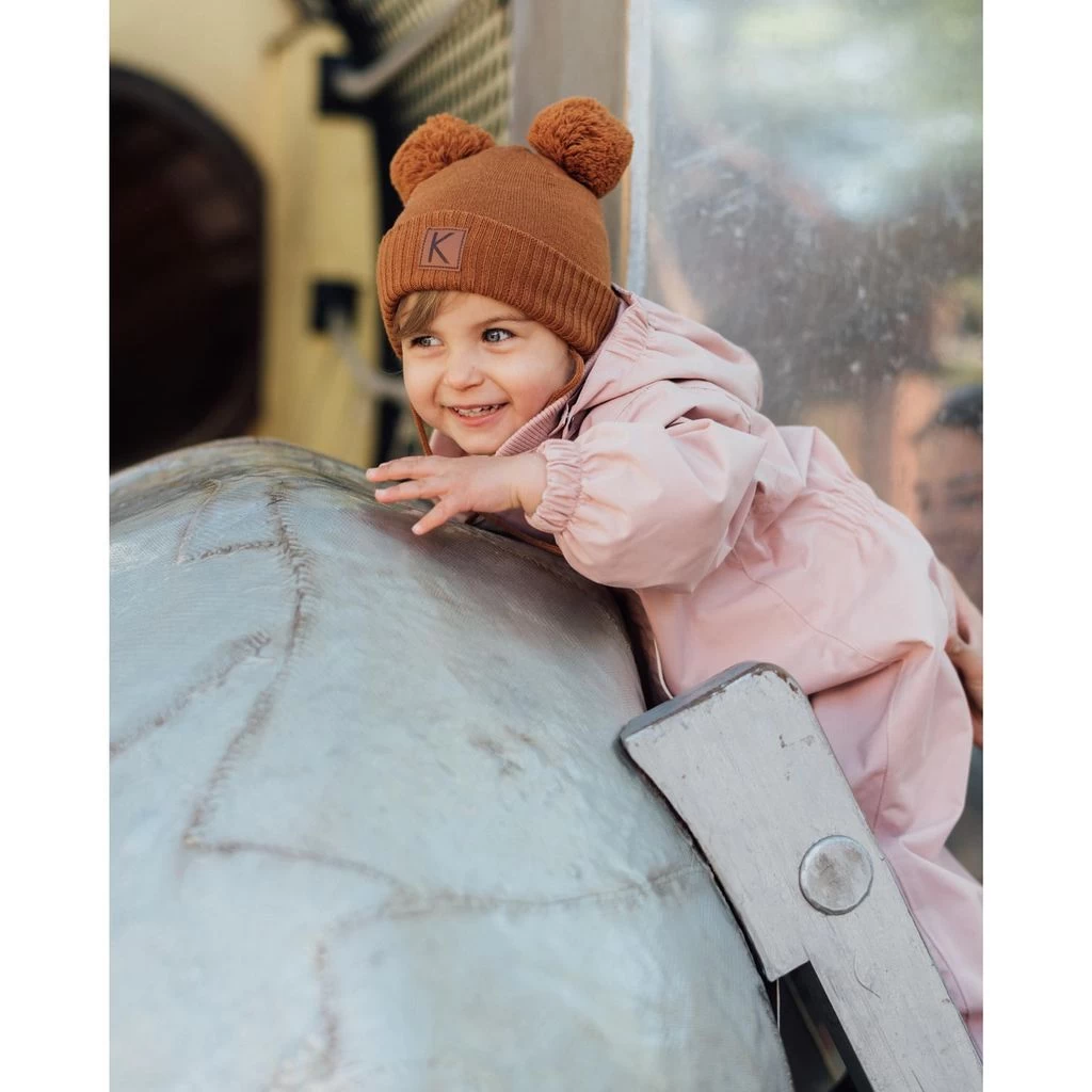 Keep little heads warm. Brown Prag hat by Kuling. The hat has a knitted design. It has playful pom-poms at the top, a folded hem and tie strings at the chin.