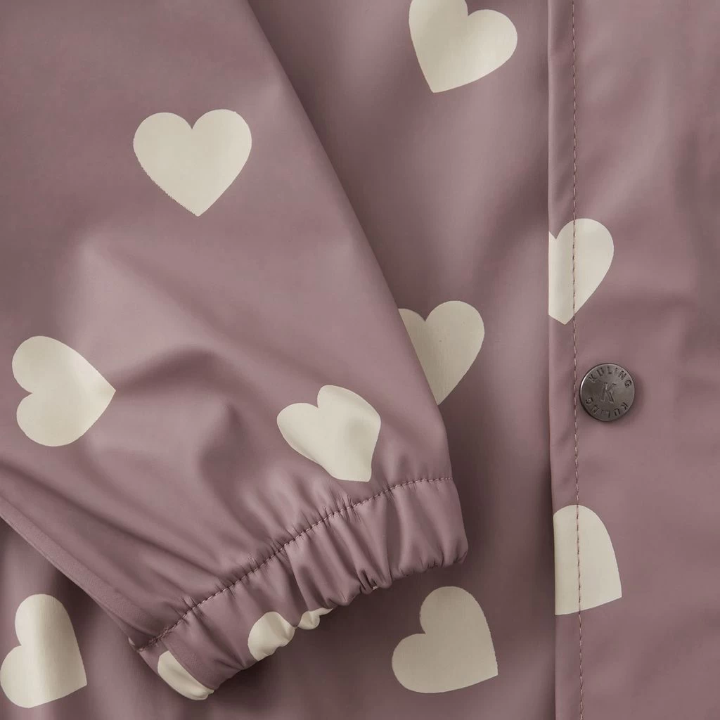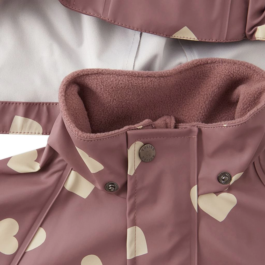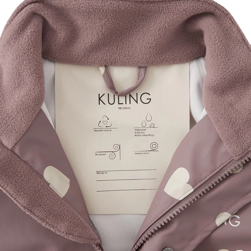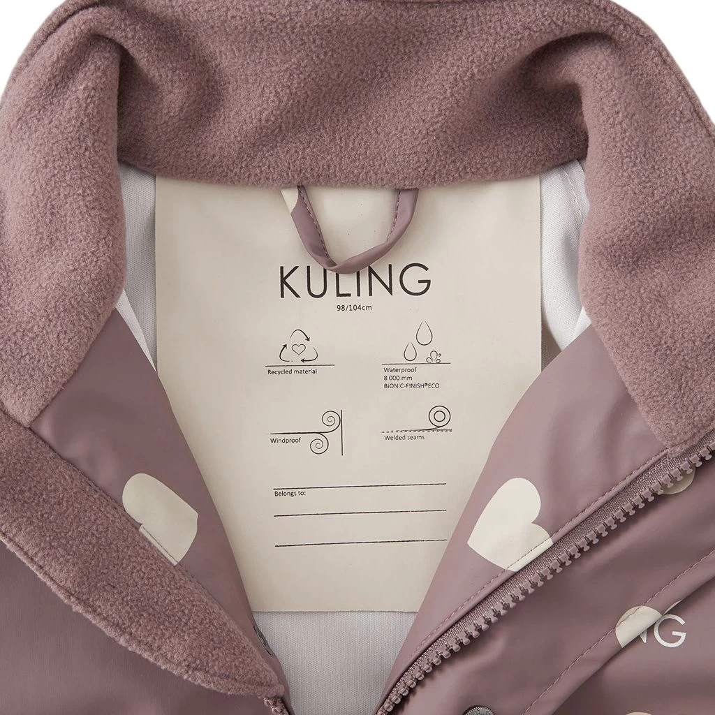Time to jump through puddles. Purple San Marino rain set by Kuling. The set has welded seams. It has a jacket with a detachable hood, a zip closure at the front and elasticated cuffs, trousers with adjustable, elasticated shoulder straps, snap buttons at the sides, a front pocket, elasticated cuffs and adjustable, detachable foot loops and reflective details for visibility.
