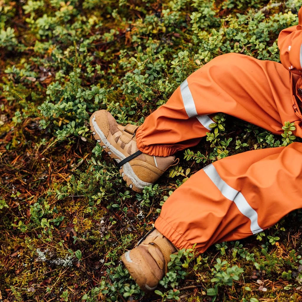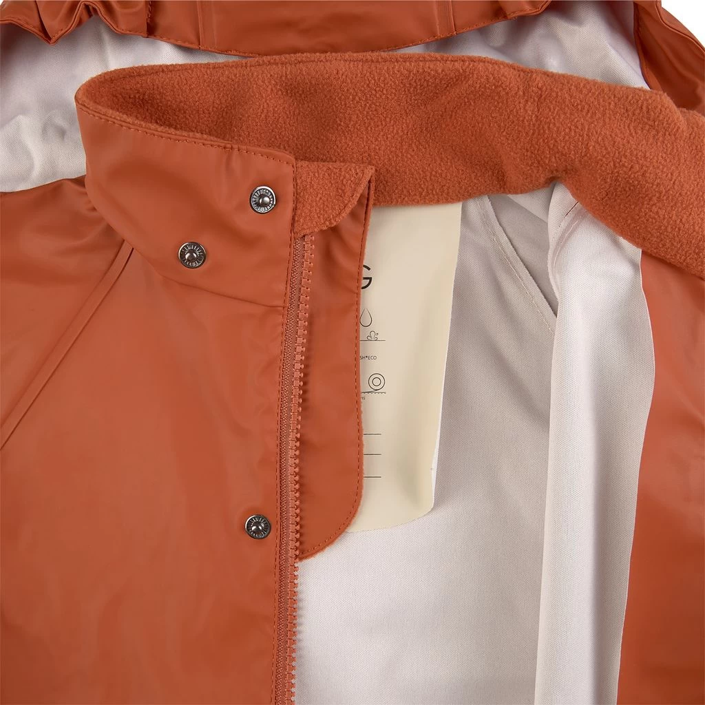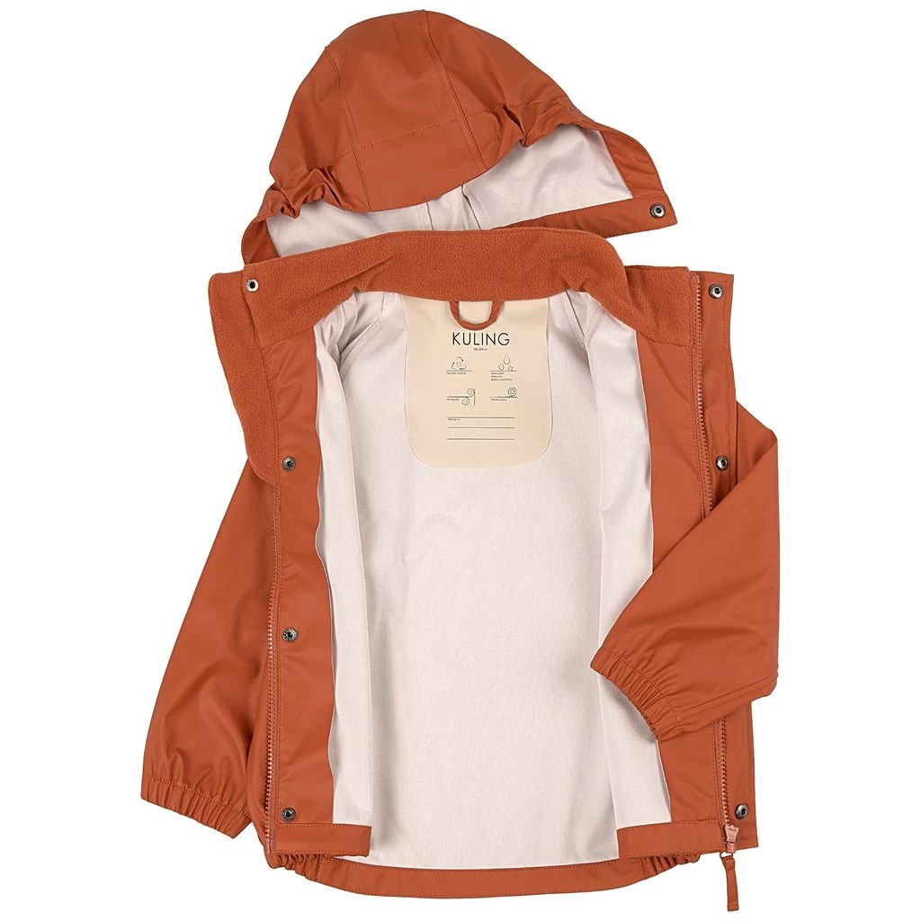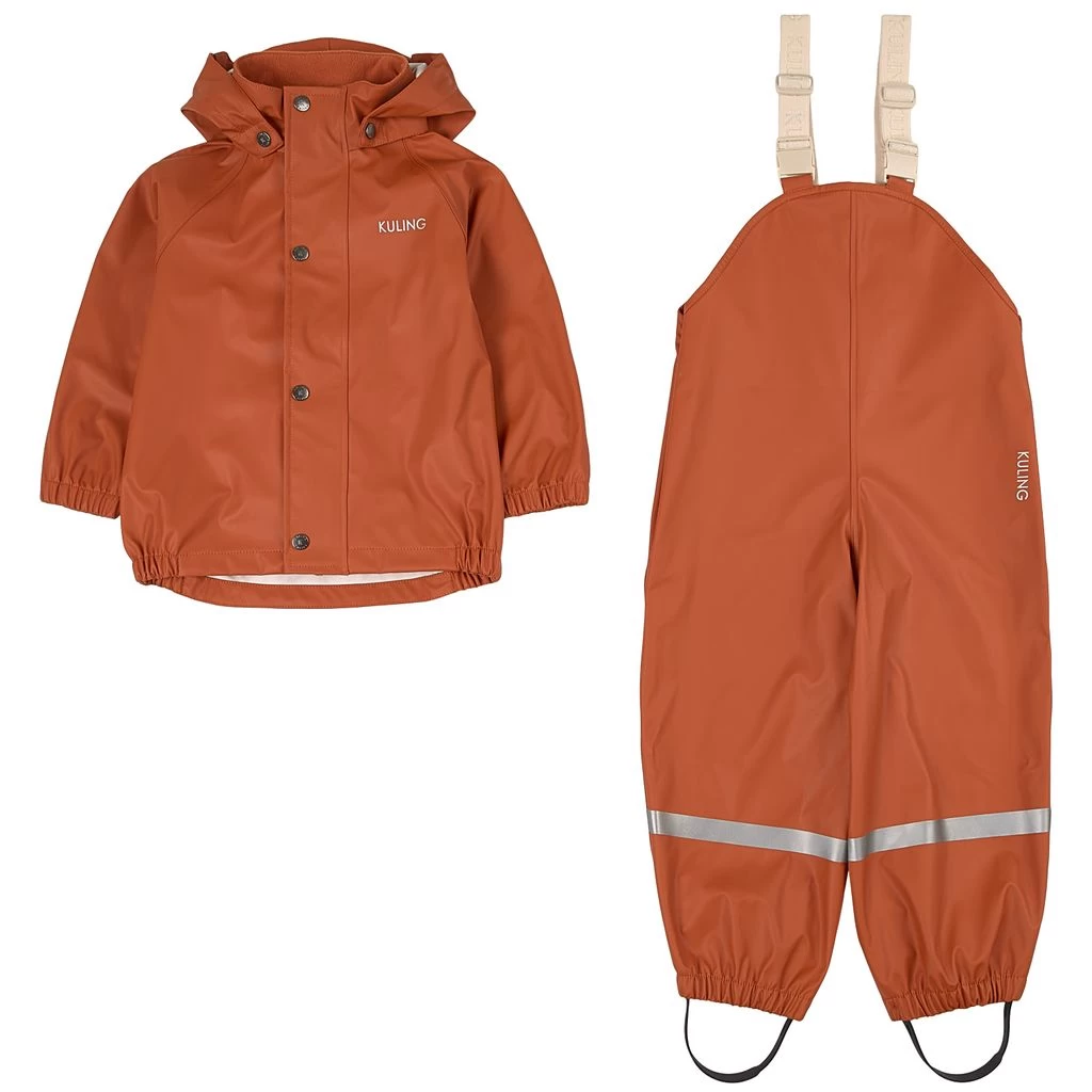 Time to jump through puddles. Brown San Marino rain set by Kuling. The set has welded seams. It has a jacket with a detachable hood, a zip closure at the front and elasticated cuffs, pants with adjustable, elasticated shoulder straps, snap buttons at the sides, a front pocket, elasticated cuffs and adjustable, detachable foot loops and reflective details for visibility.