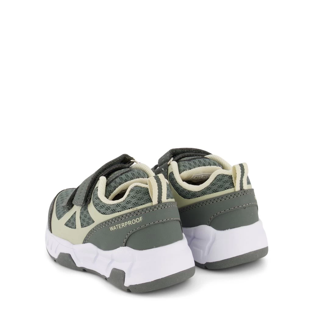 These sneakers are for adventurous kids!. Green Seattle trainers by Kuling. The trainers have a waterproof mesh upper. They have a padded collar, a velcro fastening for easy on and off, a pull-tab at the heel, a cushioned insole and a non-slip sole.