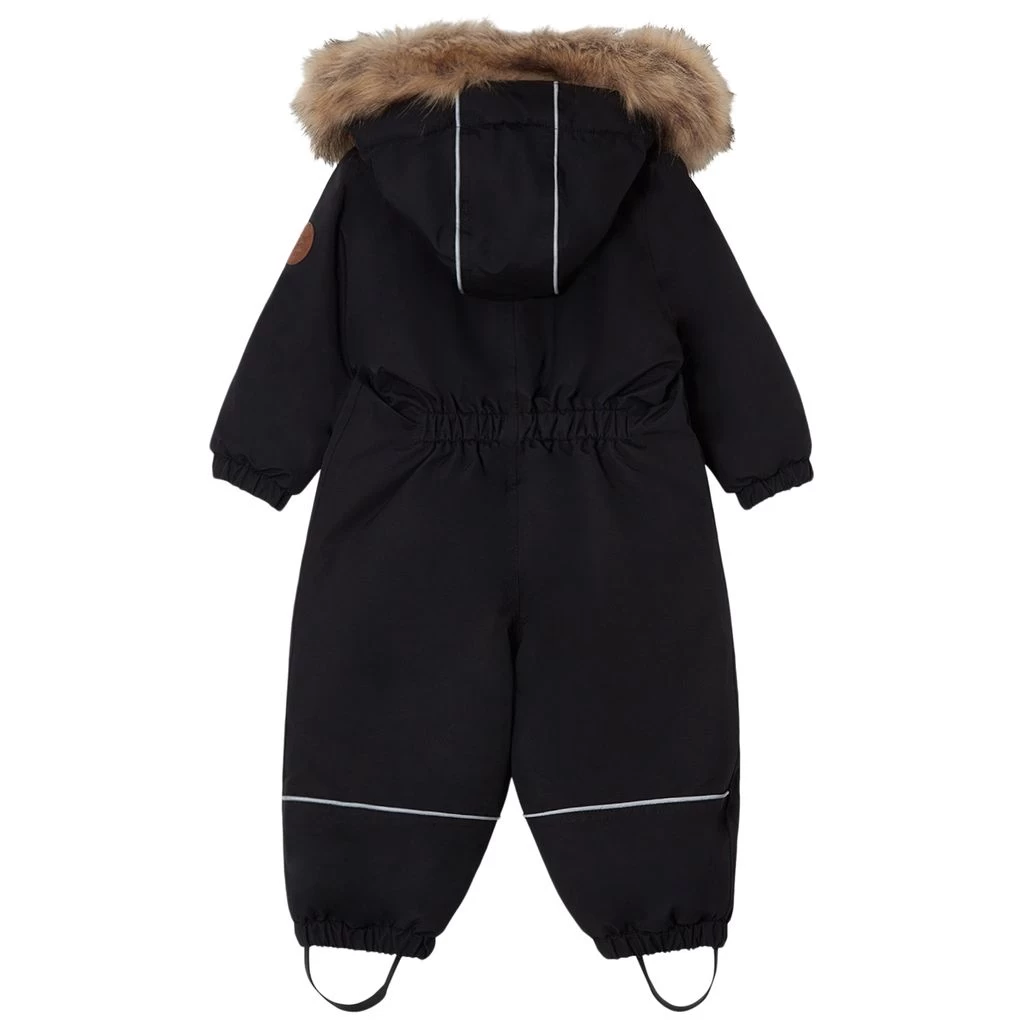 Be warm and comfy on winter adventures. Black Val D’Isere snowsuit by Kuling. The snowsuit has taped seams. It has warm padding, a soft fleece lining at the back, a detachable hood with a detachable faux fur trim, a zip closure at the front, two front pockets, elasticated cuffs, durable, adjustable silicone foot loops and reflective details for visibility.