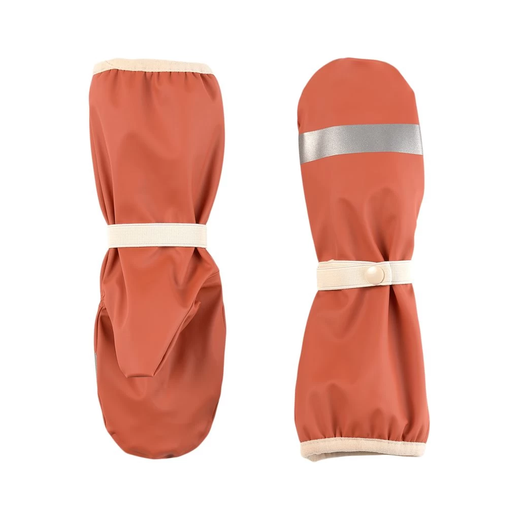 Brown Vilnius rain mittens by Kuling. The rain mittens have welded seams. They have a soft fleece lining, an elasticated strap with snap button at the wrist, elasticated cuffs and reflective details for visibility.