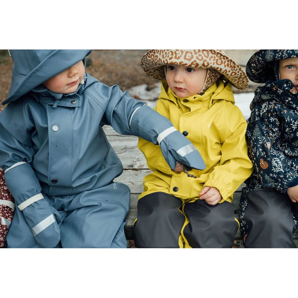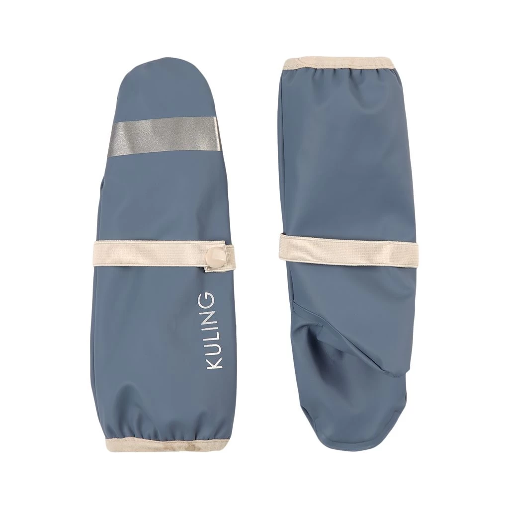 Blue Vilnius mittens by Kuling. The mittens have welded seams. They have a soft fleece lining, an elasticated strap with snap button at the wrist, elasticated cuffs and reflective details for visibility.