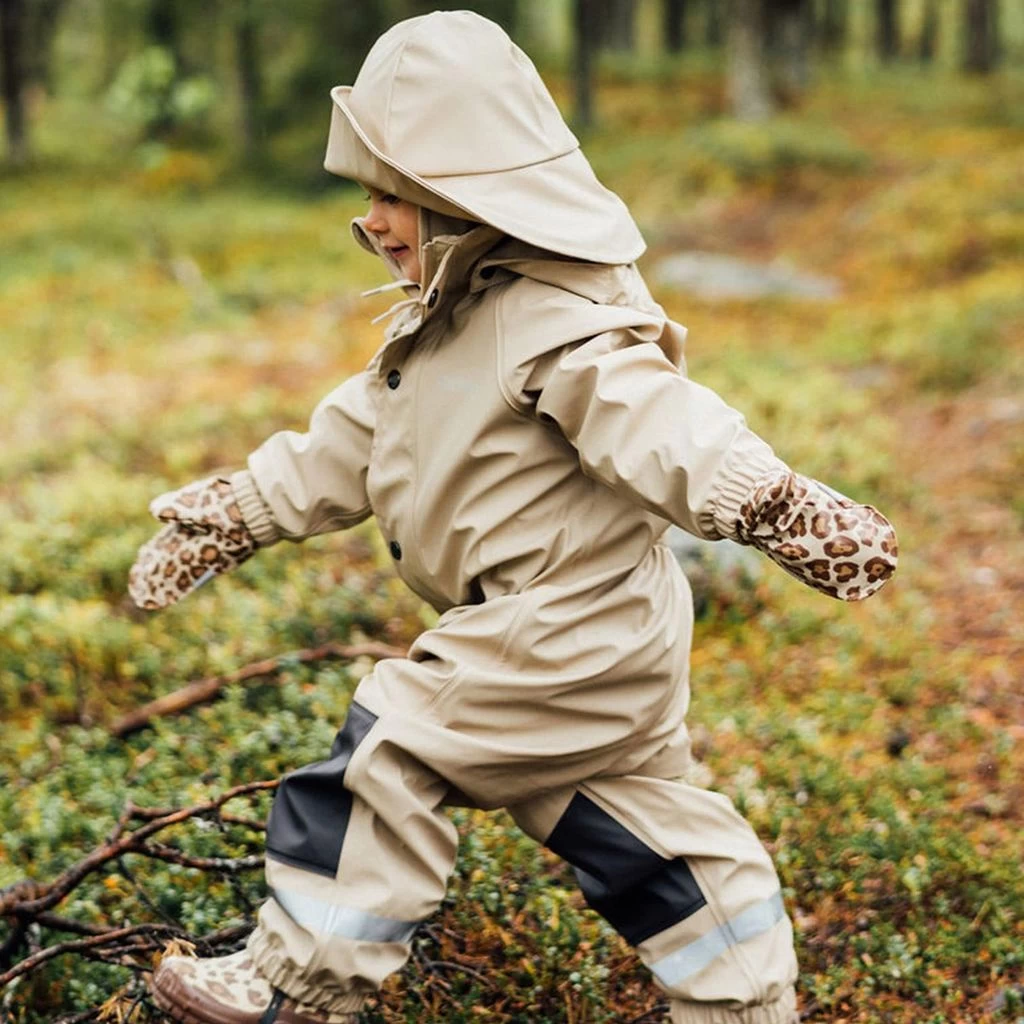 Rainy days will be so much fun. Brown Vilnius rain mittens by Kuling. The rain mittens have welded seams. They have a soft fleece lining, an elasticated strap with snap button at the wrist, elasticated cuffs and reflective details for visibility.